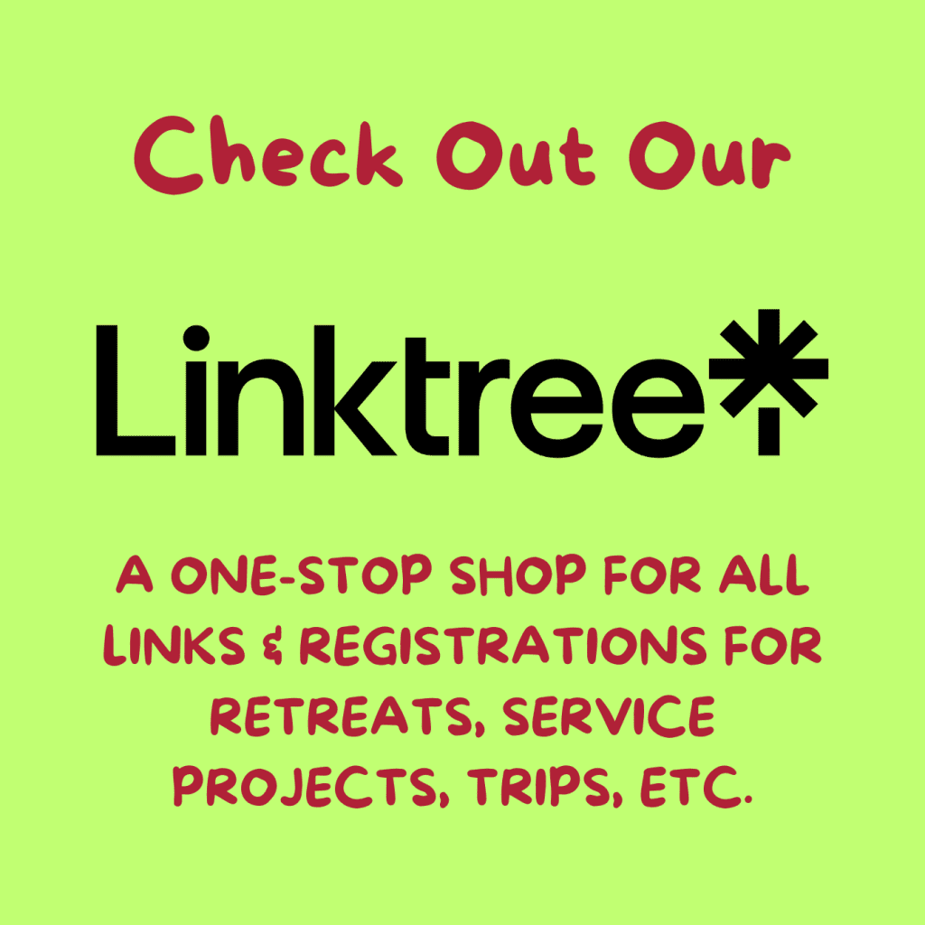 Check out our LinkTree for all links and registrations for our retreats, service opportunities, trips, etc.