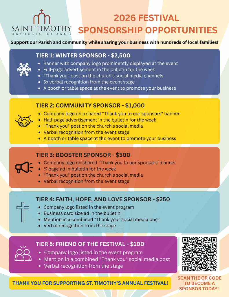 Join us as we celebrate our Patron, St. Timothy, with a yearly Parish Festival! The St. Timothy Parish Festival will always be the Saturday closest to St. Timothy’s Feast Day, this year it’s on Saturday, January 24, 2026! Join us as we celebrate the legacy of St. Timothy with faith, family, and fellowship!