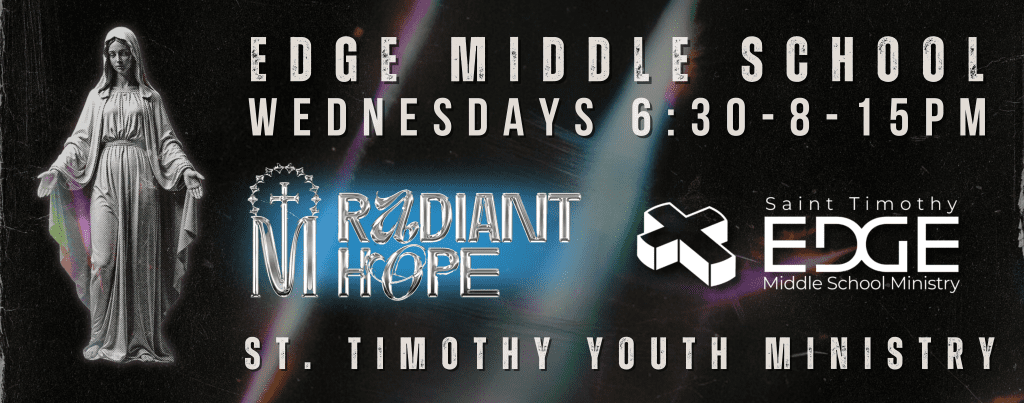 Every Middle School student at St. Timothy should be registered for our 2025-2026 Youth Ministry and Faith Formation. We all remember that middle school was awkward and difficult. That hasn’t changed. However, societal shifts have made the middle school years more difficult than ever. It’s such an integral part of our students lives in these formative years in helping them develop a strong relationship with Christ and dealing with the many trials they will come face to face with in Middle School. Not only that but our EDGE Middle School program is fun, engaging and a place that students want to be apart of in our amazing Youth Center and gym that we utilize every single Wednesday. We realize sports and other extra curricular activities get in the way occasionally on Wednesdays but registering students gives them access to all our activities throughout the year including trips and retreat. Not only that but parents will also receive amazing online tools, resources and support groups that are sure to help you as a parent. So parents please register today!!!